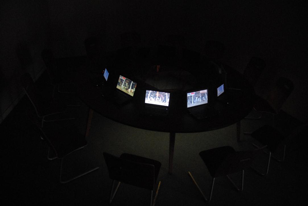Table, chairs, installation with 12 channel video
