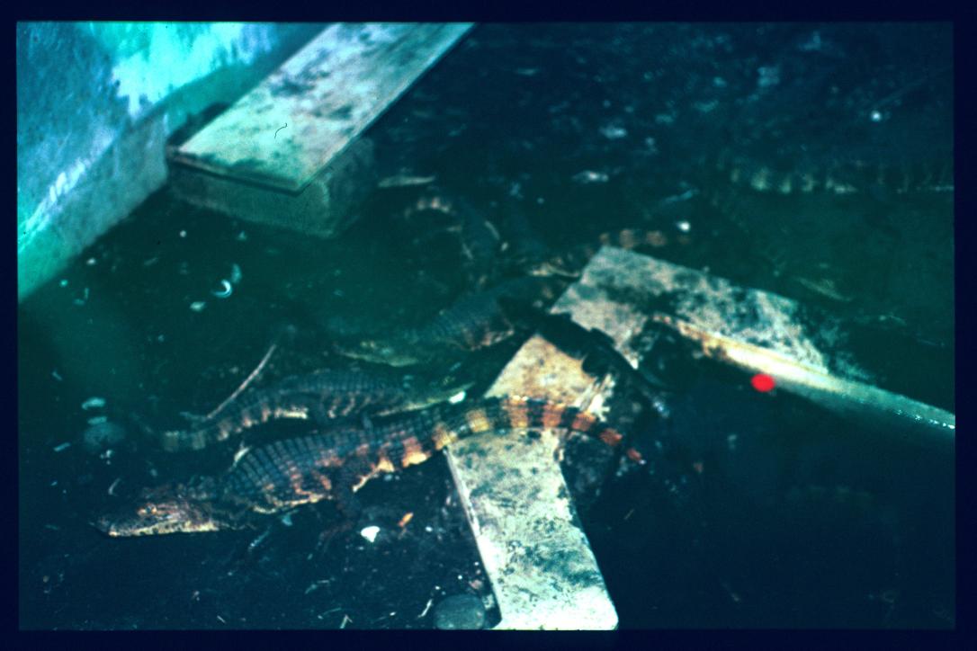 Nicaragua 1992/cocodrilo (caiman? en una municipalidad cerca de Managua)/caiman in a city pond/basin near Managua/Krokodil in einem Wassergraben/public